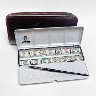 Schmincke Horadam Aquarell Set in an enamelled watercolour box with a leather case.